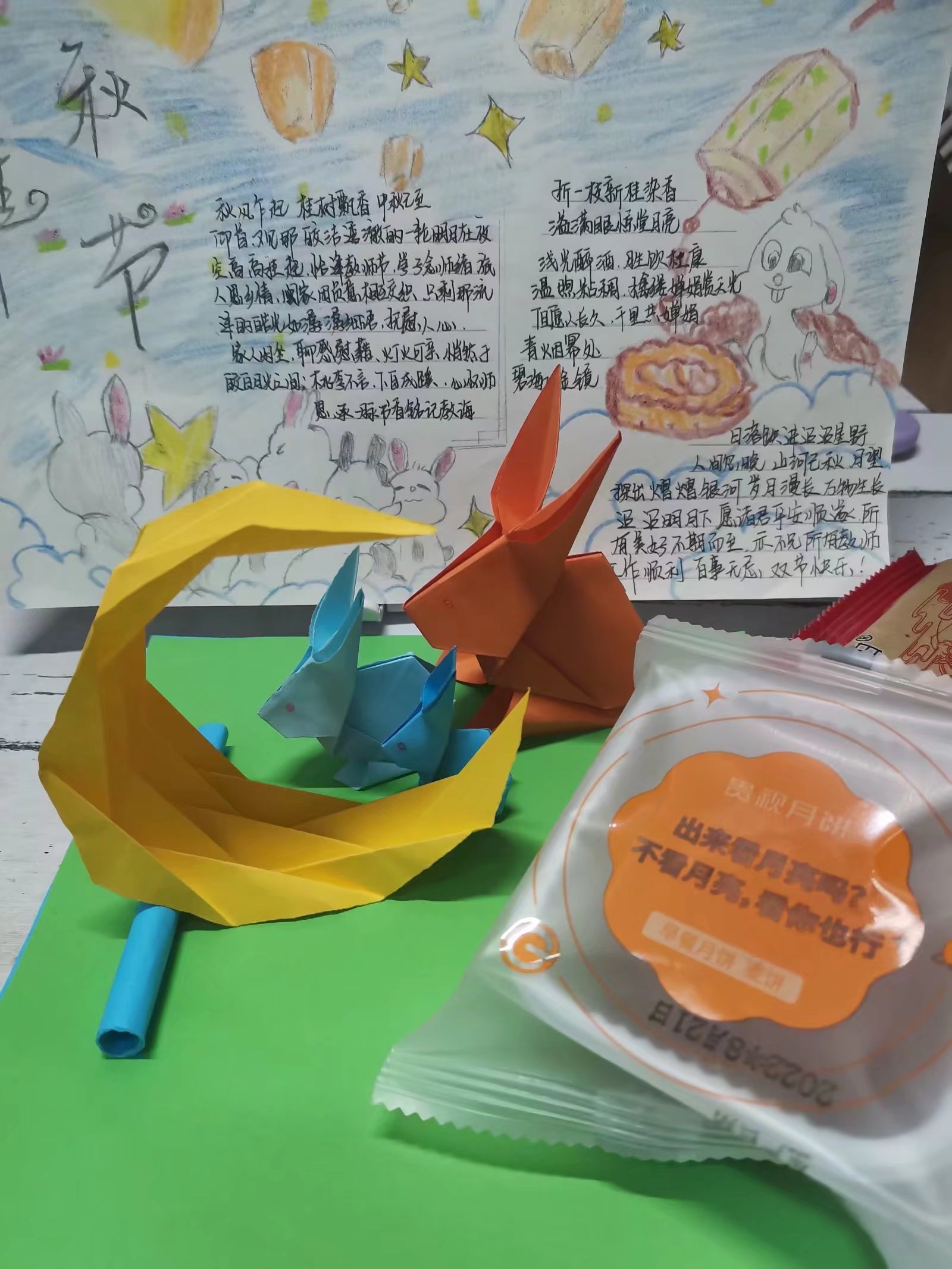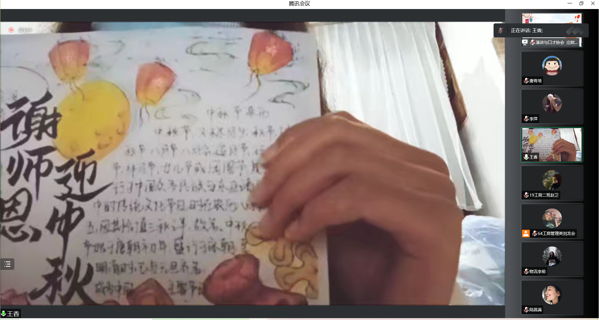 整场联欢会既有校园志愿者感人故事的分享、又有清脆悦耳的歌声和激情澎湃的吉他弹唱。互动游戏环节,同学们猜灯谜、背古诗、畅聊有关中秋节的童年轶事和故乡的风俗文化。部分同学们精心准备了感谢老师、庆祝中秋的折纸、手抄报等,表达了同心抗疫、共克难关,心怀感恩、期待明天的美好祝福。