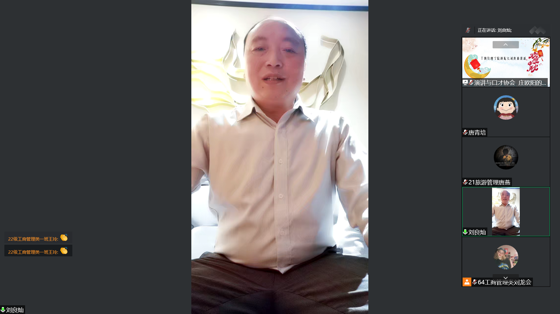 杨阳首先感谢为学校疫情防控坚守在一线的老师们,感谢遵守防疫要求、为疫情防控贡献力量的老师同学们,其次她祝愿所有老师同学们中秋教师双节快乐、身体健康、心想事成,希望全院上下齐心协力早日打赢这场疫情防疫攻坚战。刘良灿讲到特殊时期我们全体师生要积极抗“疫”,认真推进网络教学有序开展,全力保障老师同学们停课不停学、停课不停教。