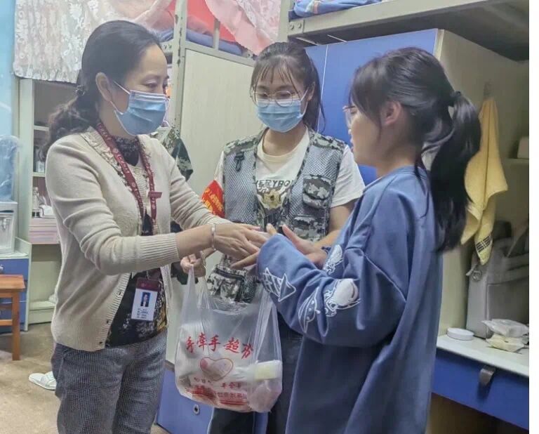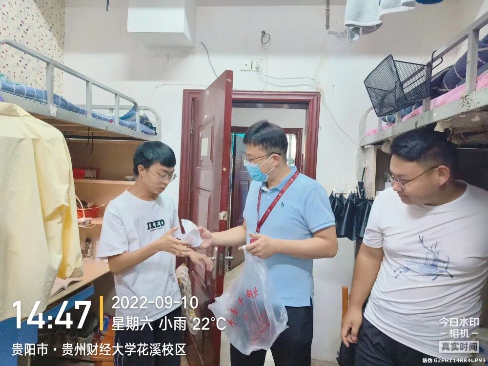 党委书记杨阳、副书记何瑞,带领“兵锋”志愿服务队队员走进学生寝室,将月饼等慰问物资送同学们手中,并对同学们致以节日的问候。杨阳与同学们亲切交谈,她表示,同学们坚决服从学校疫情管理规定,积极配合学院完成多轮的核酸、抗原检测,与学院共同抗疫,守护平安,这体现了我们新时代的“工商精神”,值得我们赞赏和肯定,也为我们2022级新同学上了一堂生动的“思政课”。希望同学们克服暂时的困难,继续服从学校统一部署安排,坚持上好网课,出门戴口罩,回家要洗手,全院上下一心,凝心聚力,竭尽全力打赢这场疫情防控阻击战。