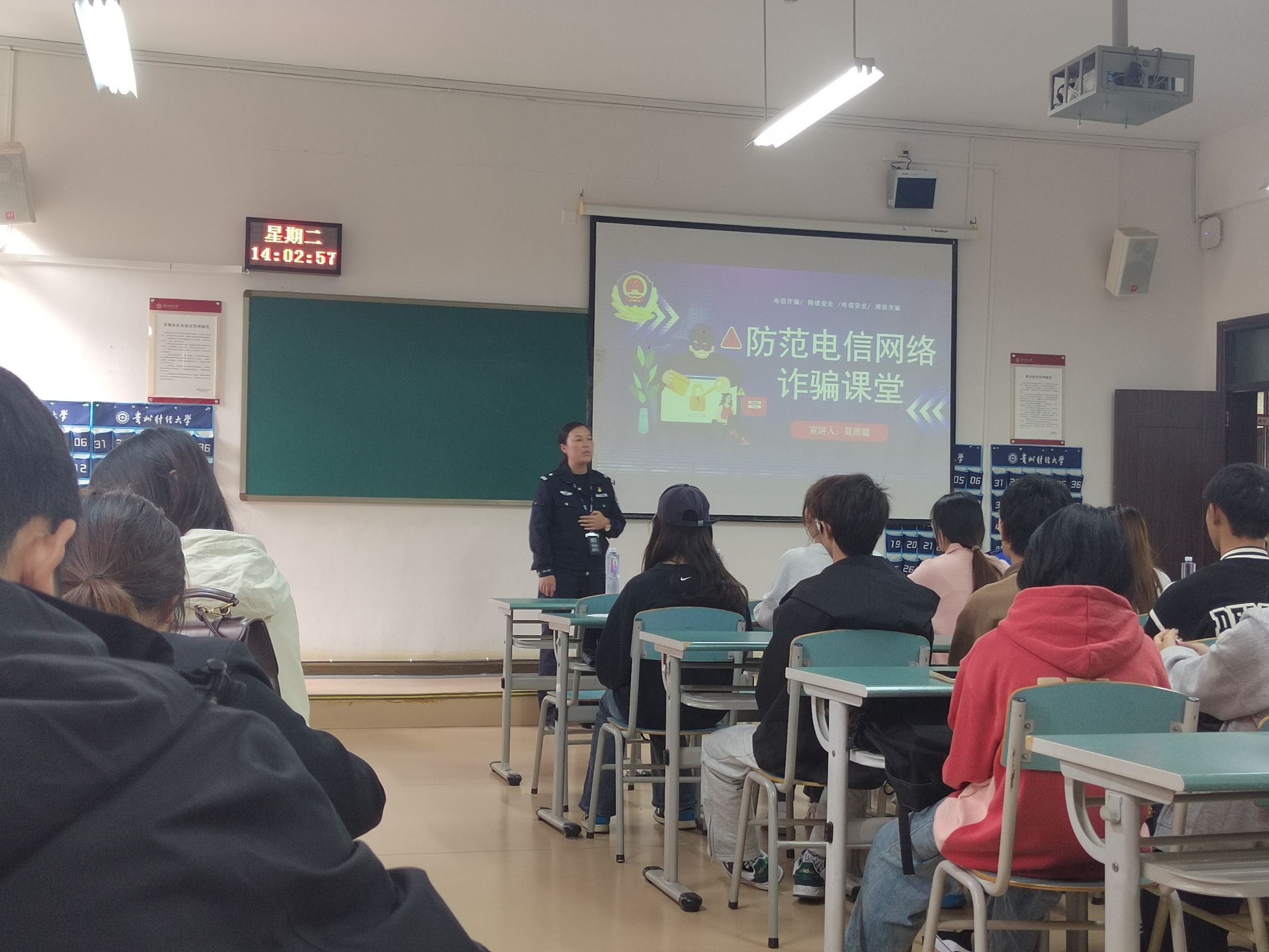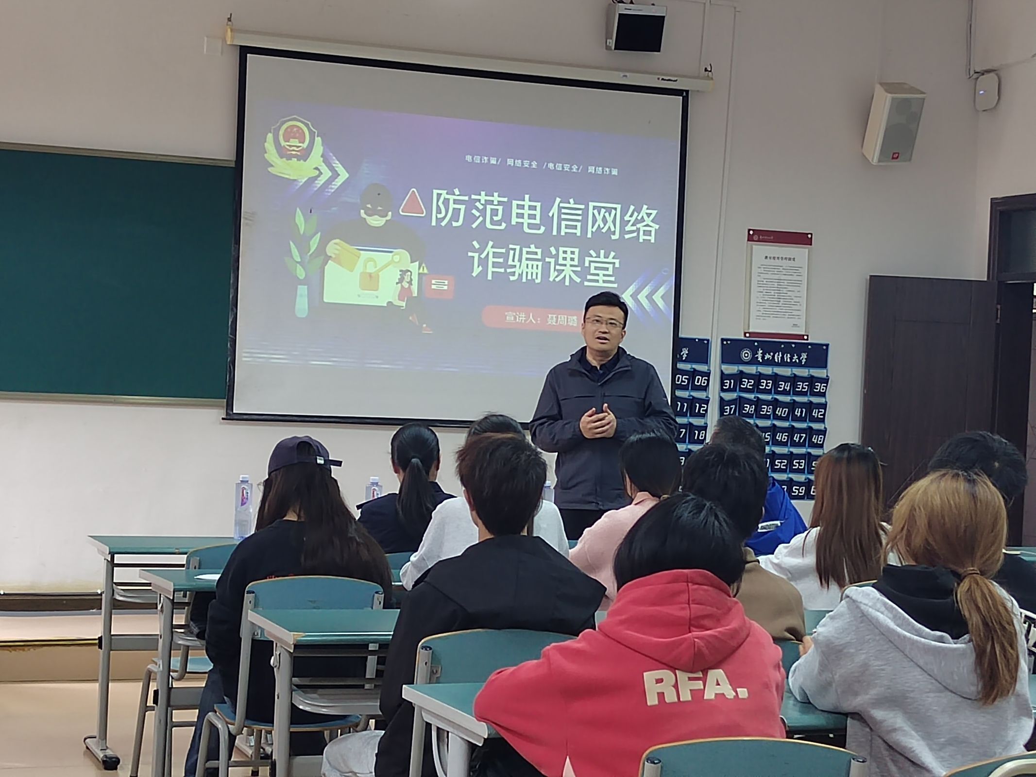 2024年11月5日下午,马会app “兵锋”校园志愿服务队联合校保卫处党支部开展“反诈防骗,你我同行”反诈宣讲活动。贵安新区公安局刑侦支队聂周璐警官一行五人,马会app 党委副书记何瑞、学生科科长蒋小芳,校保卫处综保科科长田再时,学生社区楼层长、寝室长等共90余人参加了本次宣讲会活动。培训由贵安新区公安局刑侦支队的聂周璐警官主讲,翠竹苑社区第二党支部协办。