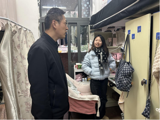 随后,杜剑副校长一行深入学生寝室,与同学们面对面亲切交流。每到一间寝室,他都仔细察看住宿环境、设施配备及消防安全情况,关切地询问同学们来自哪里、是否适应校园生活、学业进展如何,以及在生活中是否存在困难。当看到寝室环境干净整洁、同学们相处融洽时,杜剑副校长十分欣慰,他勉励同学们要珍惜大学时光,既要扎实学好专业知识,也要学会与人相处,在集体生活中培养团队协作意识和独立生活能力,共同营造文明和谐的寝室氛围。