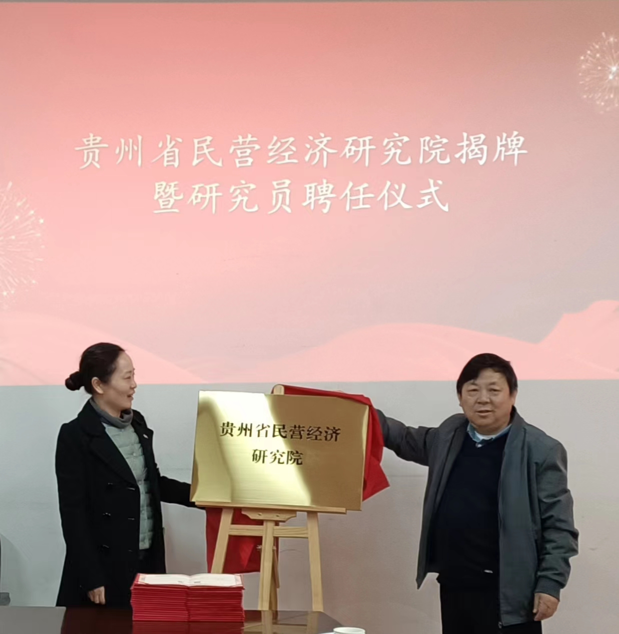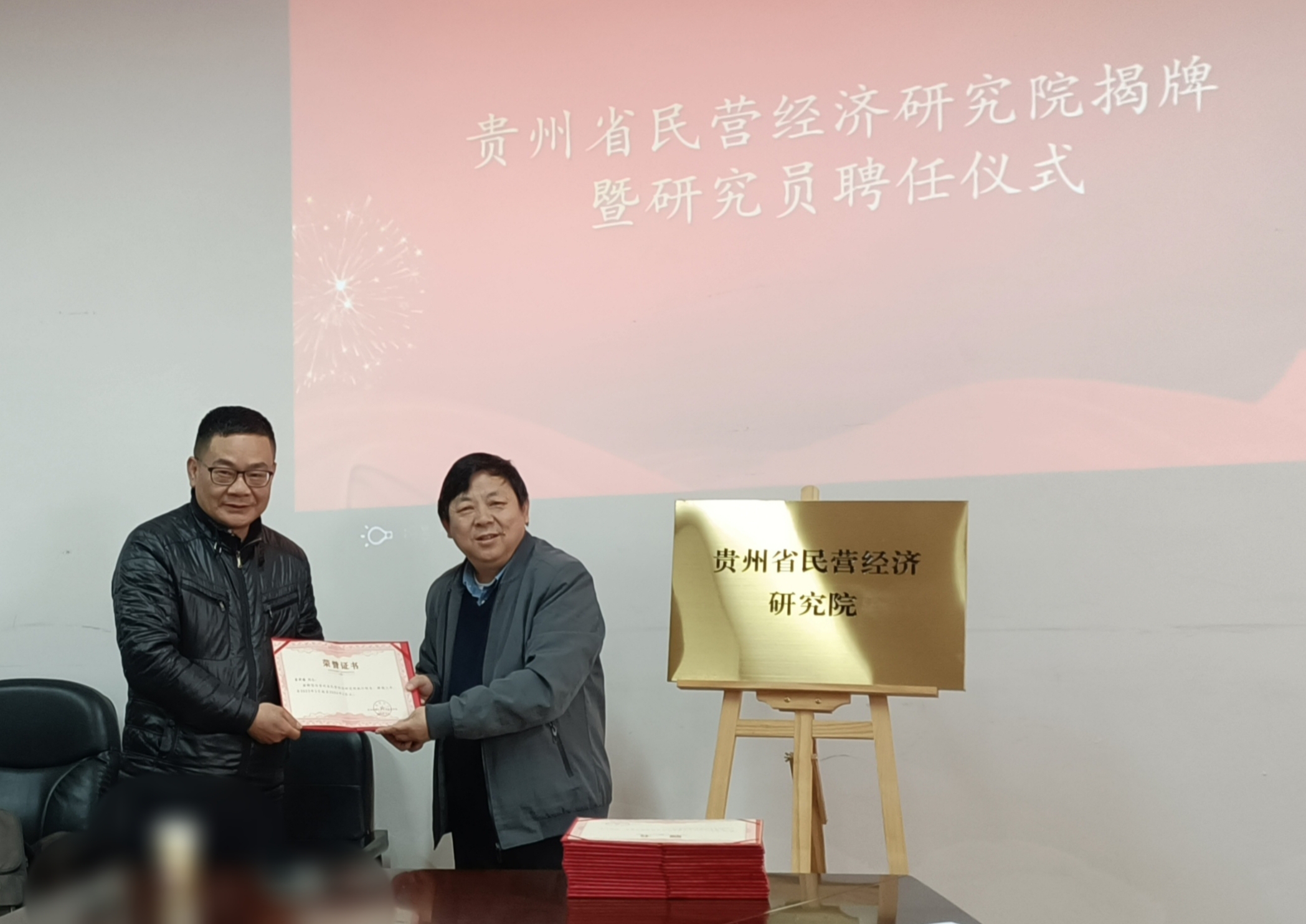 徐大佑为贵州省民营经济研究院揭牌并向受聘研究员颁发了聘书。徐大佑在讲话中表示,贵州省民营经济研究院的成立具有重大意义,是机遇,也是挑战,有荣誉,也有责任,学校将大力支持研究院的发展,希望研究院充分利用人才优势,借助贵州省工商业联合会平台,把项目落实到实处。通过提升企业服务精细度、优化企业营商环境等举措,促进贵州省民营经济健康稳定高质量发展。
