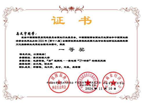 左文超、胡北明老师共同指导,2022级旅游管理邱雪梅、2023级旅游管理马文宇等五名学生组成的参赛队伍,在比赛中荣获全国一等奖。