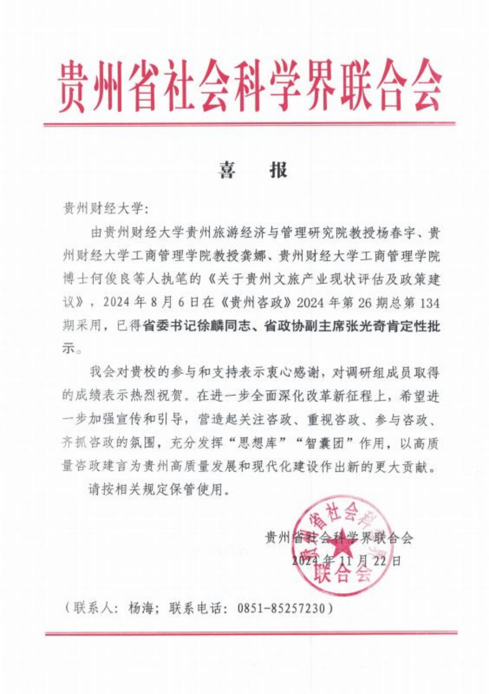 近日,由贵州财经大学贵州旅游经济与管理研究院院长杨春宇、马会app 教授龚娜等人执笔的《关于贵州文旅产业现状评估及政策建议》一文,在《贵州咨政》2024年第26期总第134期上发表,该文针对贵州文旅产业的现状进行了深入剖析,并提出了具有前瞻性和可操作性的政策建议。