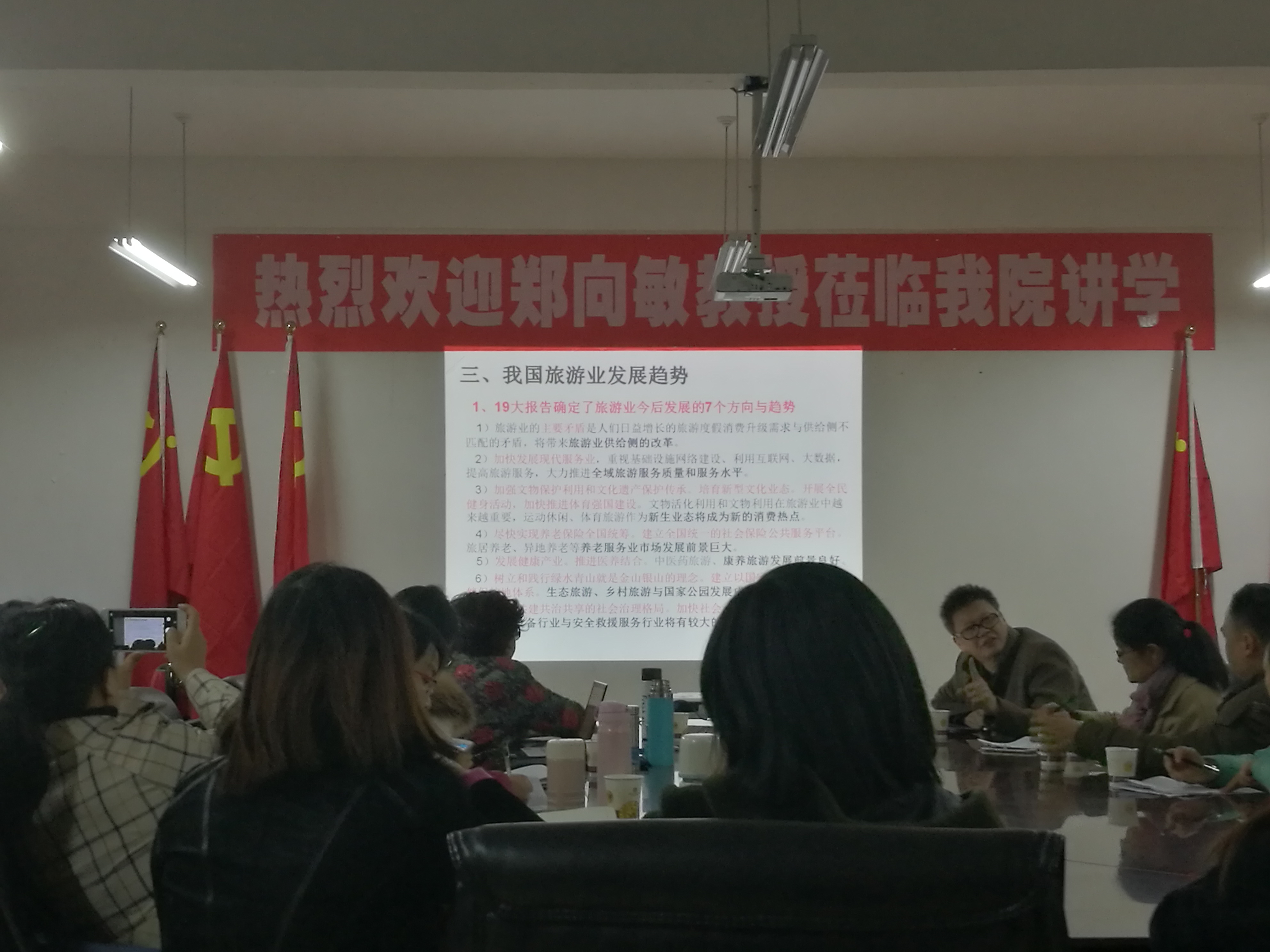 12月27日下午13:30-16:00,在崇德楼306会议室,受工商学院邀请,旅游界知名专家郑向敏教授做了主题为《旅游学术研究前沿和国家社科申报注意事项》的学术交流。会议由胡北明副院长主持,工商学院旅游管理系全体教师和研究生参加。会上,郑教授以我国目前旅游业发展为背景,分析了我国旅游业发展七个新趋势。郑教授强调,国家社科基金旅游类的申报要以党中央十九大报告和国家旅游局“5.15”战略为切入点,注重“旅游+”相关问题研究的思维创新,并针对贵州省大数据、大扶贫、大健康、大旅游等战略,提出与旅游发展相结合的一些选题意见。会后,郑教授积极与2018年预申报国家社科基金的老师进行一对一辅导交流,从社科基金评审要求、注意细节、选题要求、前期成果、团队成员、内容结构等多个方面,给出修改意见。大家教师纷纷表示受益匪浅,机会难得,感谢学校和分院组织这样的学术交流,让自己不断完善社科基金申报材料。