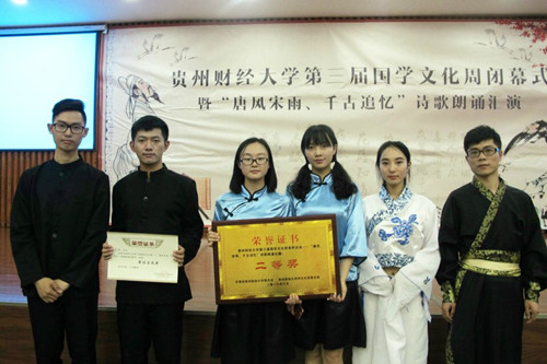 6月14日,由共青团贵州财经大学委员会主办,校社团联合会承办的第三届国学文化周系列活动——“唐风宋雨,千古追忆”诗歌朗诵比赛在图书馆报告厅举行。经过激烈角逐,工商学院选送的朗诵代表队表现优异,荣获第二名的好成绩。