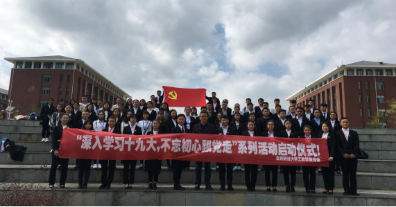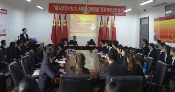 本次启动仪式由工商学院党委副书记范嘉虹老师致辞并宣布启动仪式开始,她在发言中谈到作为党的新生力量应该坚持党的基本路线,贯彻落实十九大精神。党委副书记陈劲松老师解读了在十九大会议报告中,中国特色社会主义进入新时代,我国社会主要矛盾已经转化为人民日益增长的美好生活需要和不平衡不充分的发展之间的矛盾。党员是实践“不忘初心,牢记使命”的先行者,要长久的学习十九大精神。学生第四党支部优秀党员邬尧代表党员发言中说到,作为一名学生党员要时刻关心国家时事,把建设国家为己任。