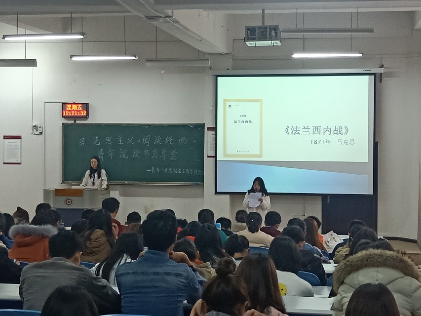 分享会开始,陈劲松副书记和孔老师分别对马克思主义的涵义进行了一番阐释。随后优秀学生代表陈琪发言,她诵读了共产党宣言,并以自己的亲身经历为例讲述阅读马克思主义经典原著给自己带来的影响。 接下来各班分享者依次作出读书分享,大家分享的马克思经典有《反杜林论》、《法兰西内战》给与的启示,《资本论》、《马克思主义基本原理概论》等等,同学们还分享了马克思主义与中国共产党的紧密联系及其对中国共产党的巨大影响。最后孔老师表示,听了各位同学的读书分享,希望大家以后经常阅读经典,提高自己的文化素养,丰富自身的知识体系。最后,本次分享会在《国际歌》的歌声中结束。