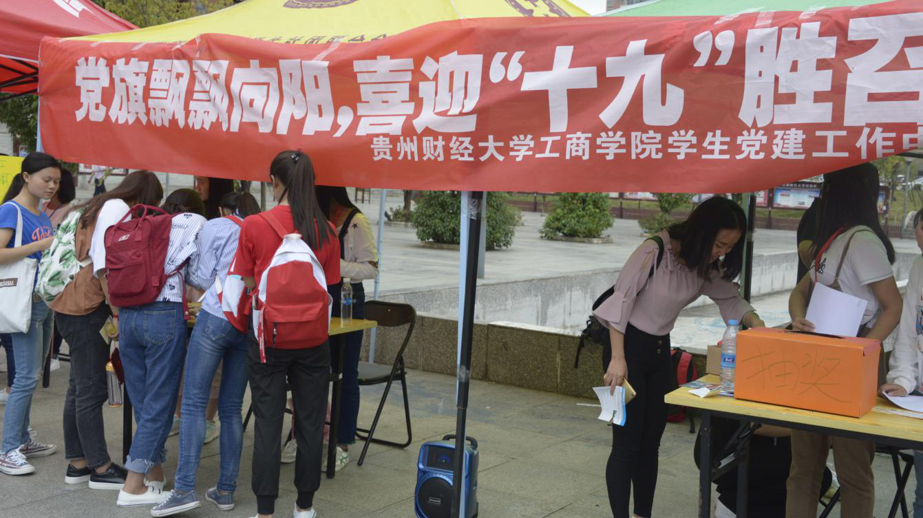 在中国共产党第十九次全国代表大会来临之际,工商学院学生党建工作中心开展了历时一个星期的主题拍摄活动,首先,在五四广场举行了以“党旗飘飘向阳,喜迎十九胜召”为主题的党知识问答,以及与党旗合影活动。其次,拍摄了工商学院党委书记余颂、党委副书记范嘉虹、党委副书记陈劲松、办公室副主任童彩华老师,以及全校师生学生送出的诚挚祝福。