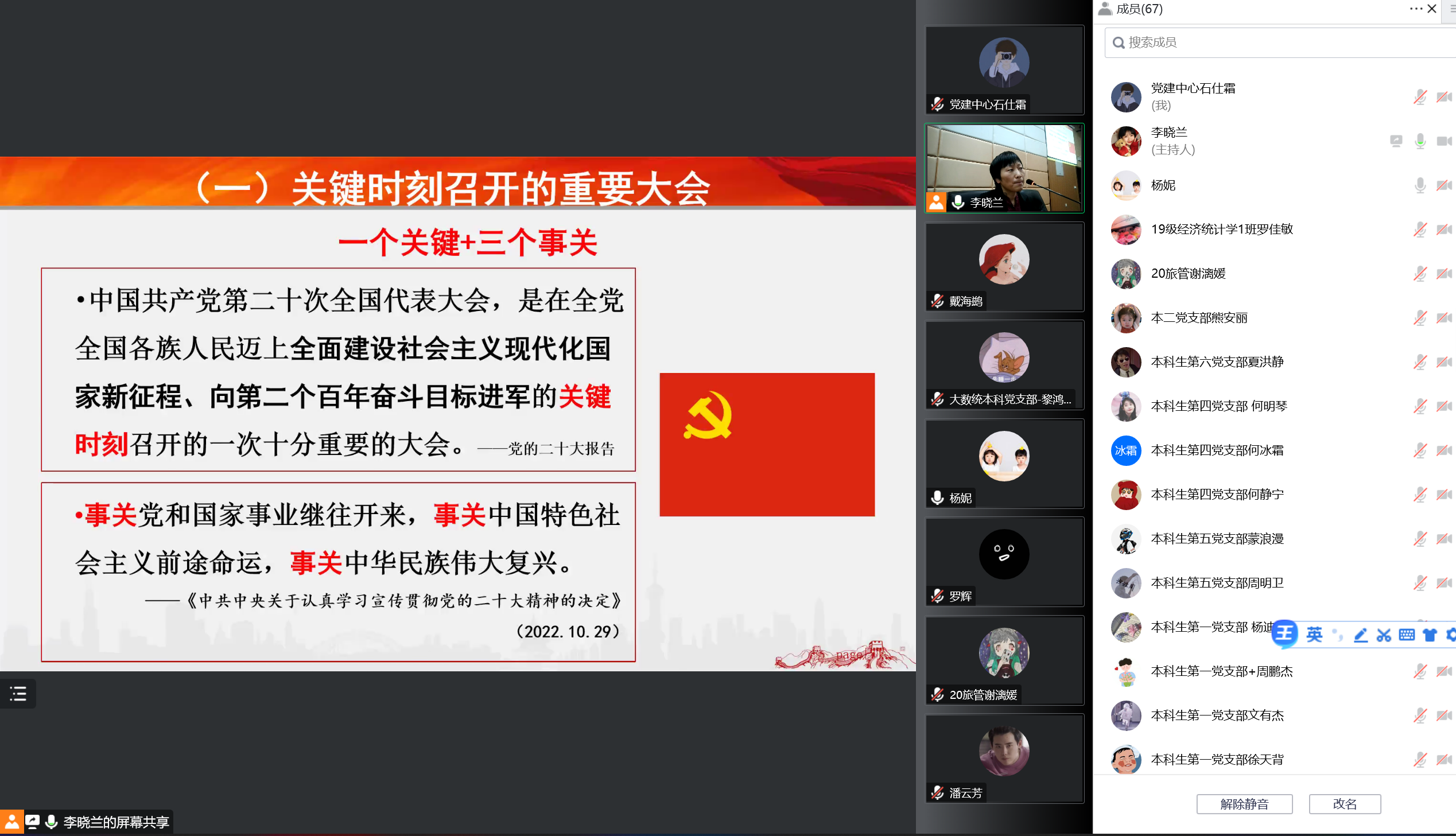 李晓兰从深刻认识党的二十大召开的意义、全面把握党的二十大精神的主要内容、贯彻落实党的二十大的基本要求这三个方面进行讲解和阐释。对于党的二十大精神的主要内容,她对过去五年的工作成就和新时代十年的伟大变革、中国共产党的指导思想、使命任务、谋篇布局等内容进行了详细地讲述。她着重阐述了在中国共产党的领导下,中国在经济建设、发展引擎、政治建设、国家治理、文化建设、社会建设、生态建设、国家安全、国防军队、祖国统一、外交、党的建设等十二个方面取得的伟大成就。她让大家牢记,中国共产党为什么能,中国特色社会主义为什么好,归根到底是马克思主义行,是中国化时代化的马克思主义行。