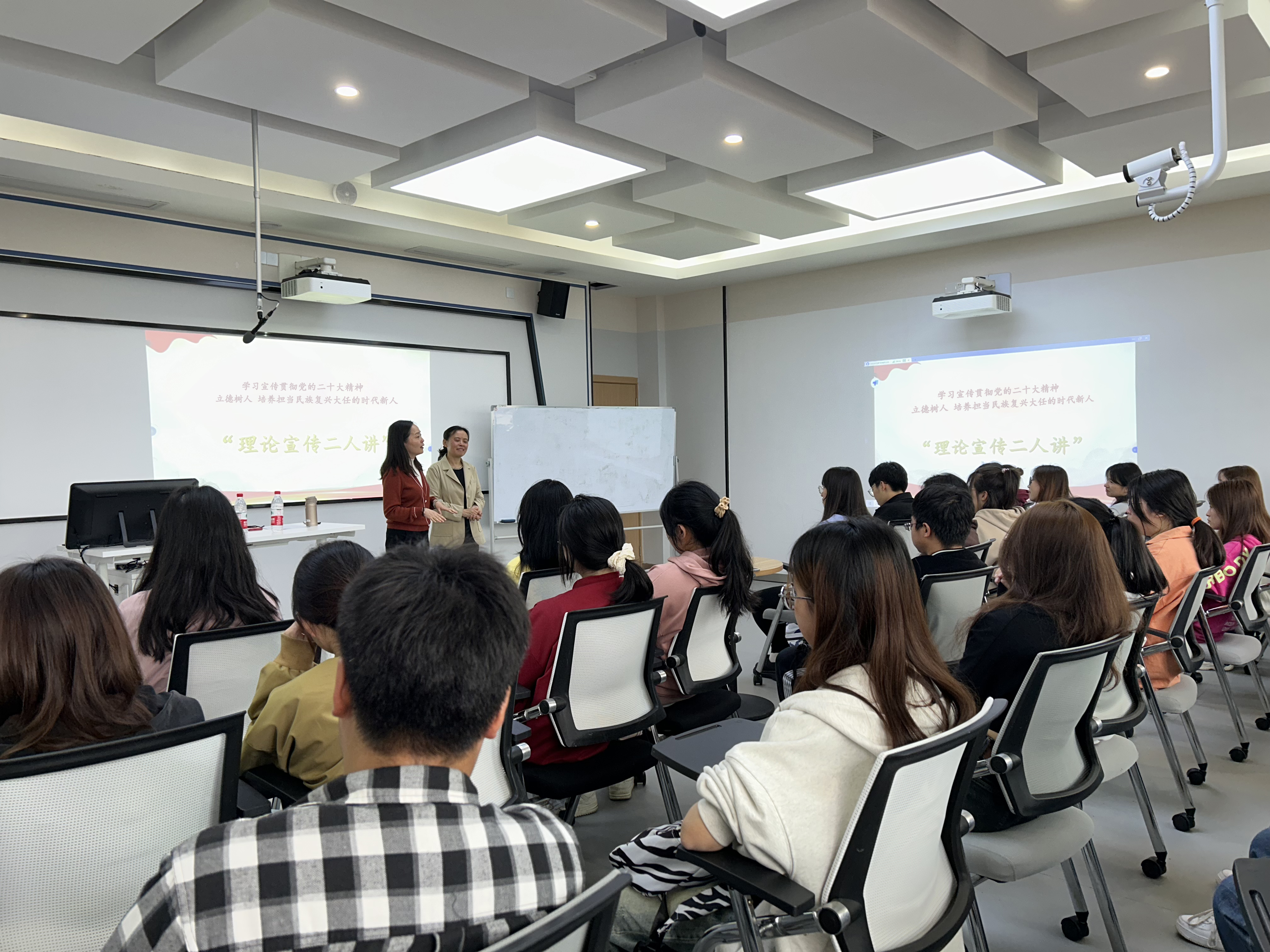党委书记杨阳、副教授黎开莉在崇德楼智慧教室开展“学习宣传贯彻党的二十大精神立德树人培养担当民族复兴大任的时代新人”理论宣传二人讲活动。