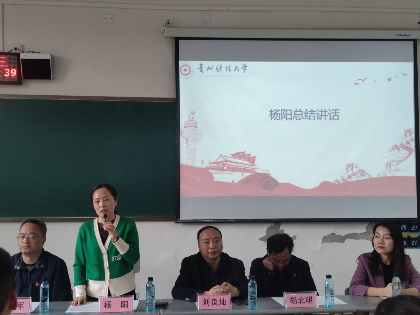 杨阳总结讲话,她对受表扬的12名同学给予了充分肯定,他们用自己的行动彰显了青春榜样的力量,展现了当代青年的风貌,号召其他学生干部向他们学习,向身边的先进和模范学习,在学习生活中发挥青年学生的榜样作用。她对学生干部提出两点期望:一是要敢于在关键时刻显真彰,做一个有锐气的闯将;二是要勇于在平凡的岗位上出光彩,做一名有担当的干将,并以“习近平总书记希望全国广大青年牢记党的教诲,立志民族复兴,不负韶华,不负时代,不负人民,在青春的赛道上奋力奔跑,争取跑出当代青年的最好成绩”共勉在座的学生干部。