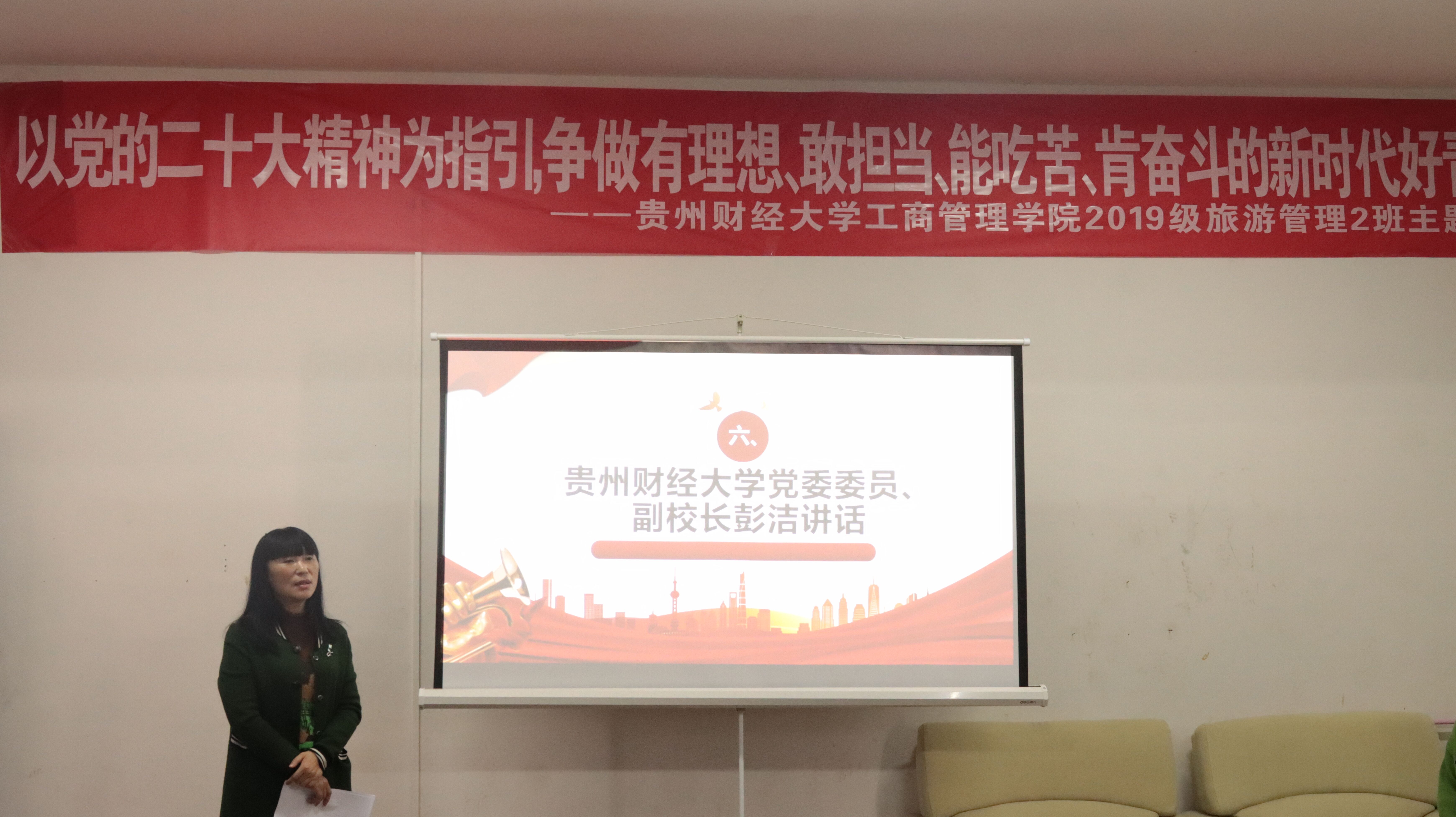 党委书记杨阳,党委副书记何瑞,2019级旅游管理二班全体同学参加,本次班会由蒋小芳老师、苏浩鹏同学主持。