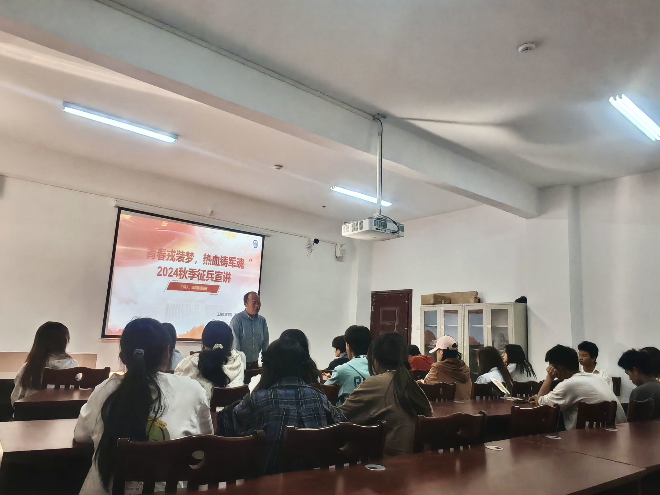 胡细根详细地向大家阐述了征兵的意义、流程以及大学生士兵在军队中的发展机遇,并列举了一系列优秀军人的事迹。胡细根讲述了军人对于国家和人民的重要性:他们是国家安全的捍卫者,在边疆守护国土,在危难时刻冲锋在前,为人民撑起一片安宁的天空。最后,介绍了大学生入伍的诸多政策:就业优势、学业深造优势、创业及技能培训优势和经济奖励政策等。