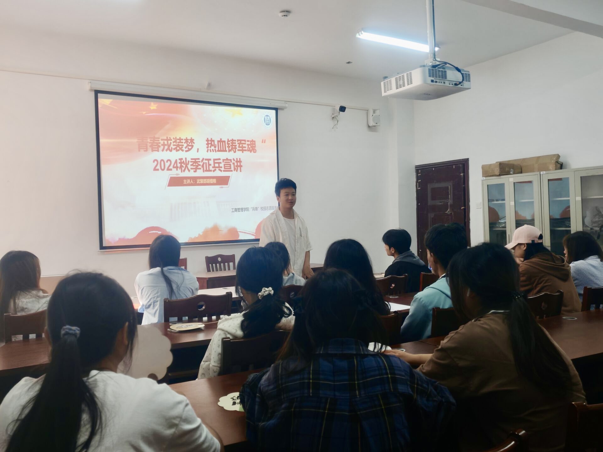 “兵锋”校园志愿服务队联合学校武装部开展了“青春戎装梦,热血铸军魂”2024年学生社区征兵宣讲会。此次活动在翠竹苑三栋四楼活动室举行,邀请了武装部的胡细根老师和退伍士兵孙建成进行宣讲,学生社区共计45名同学参加。