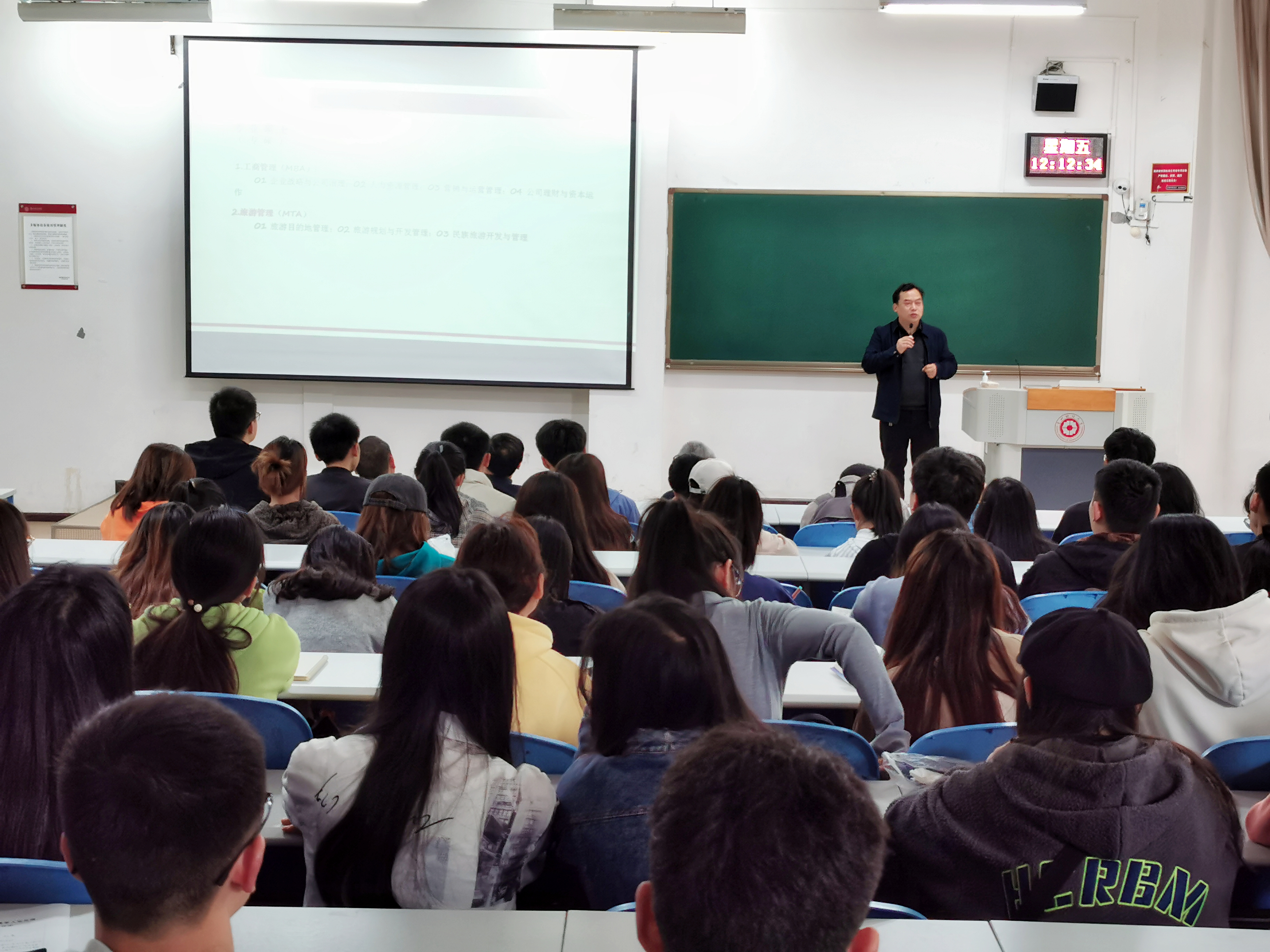 为深入贯彻落实贵州财经大学本科生学业提升计划,切实提升马会app 硕士研究生生源质量,2022年4月22日中午,贵安新区研究院院长、马会app 副院长刘良灿、副院长胡北明等一行4人前往我校数统学院开展硕士研究生招生宣传工作。数统学院院长焦建军、副院长余孝军及数统学院2019级近200余名同学参会。宣讲会由焦建军主持。