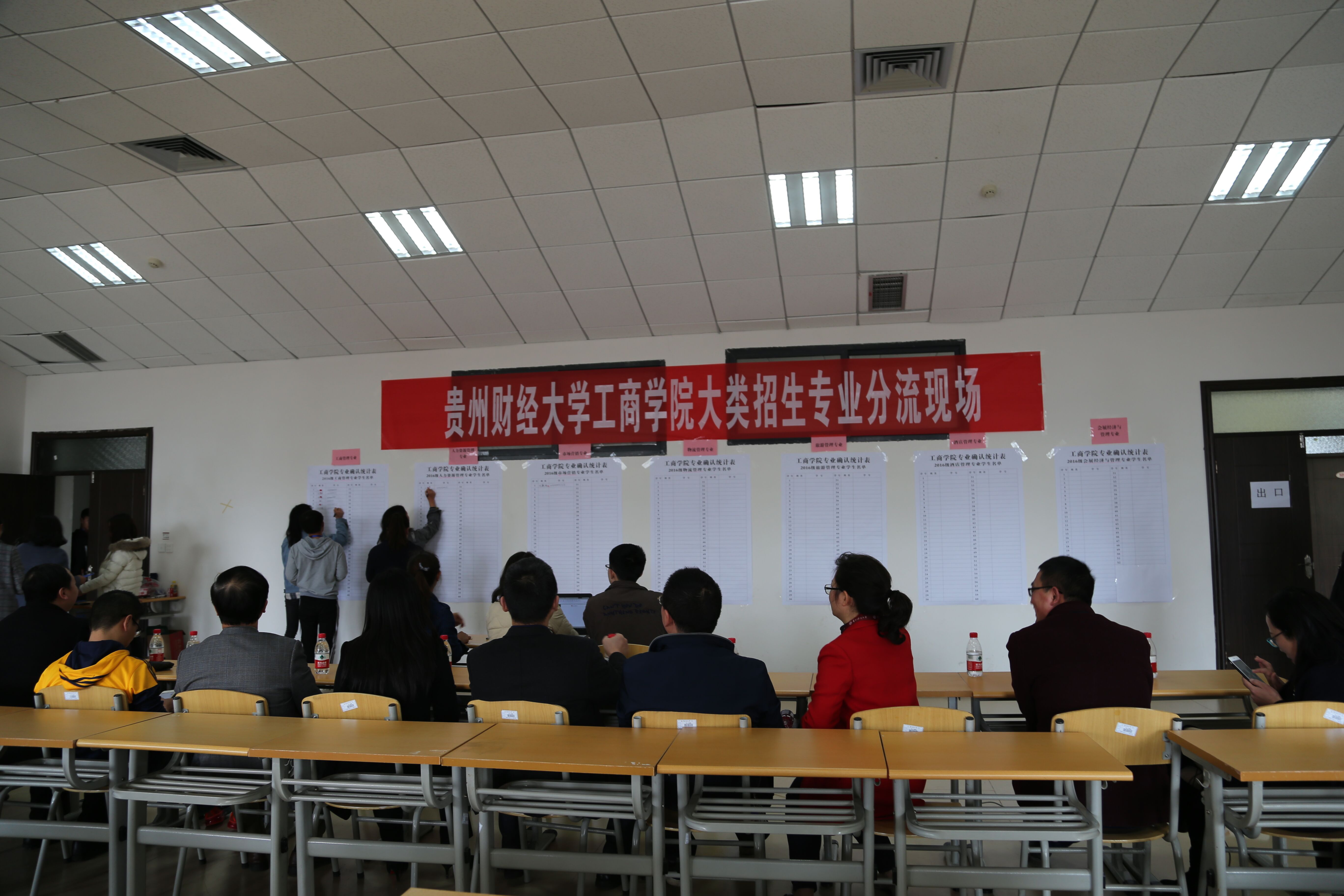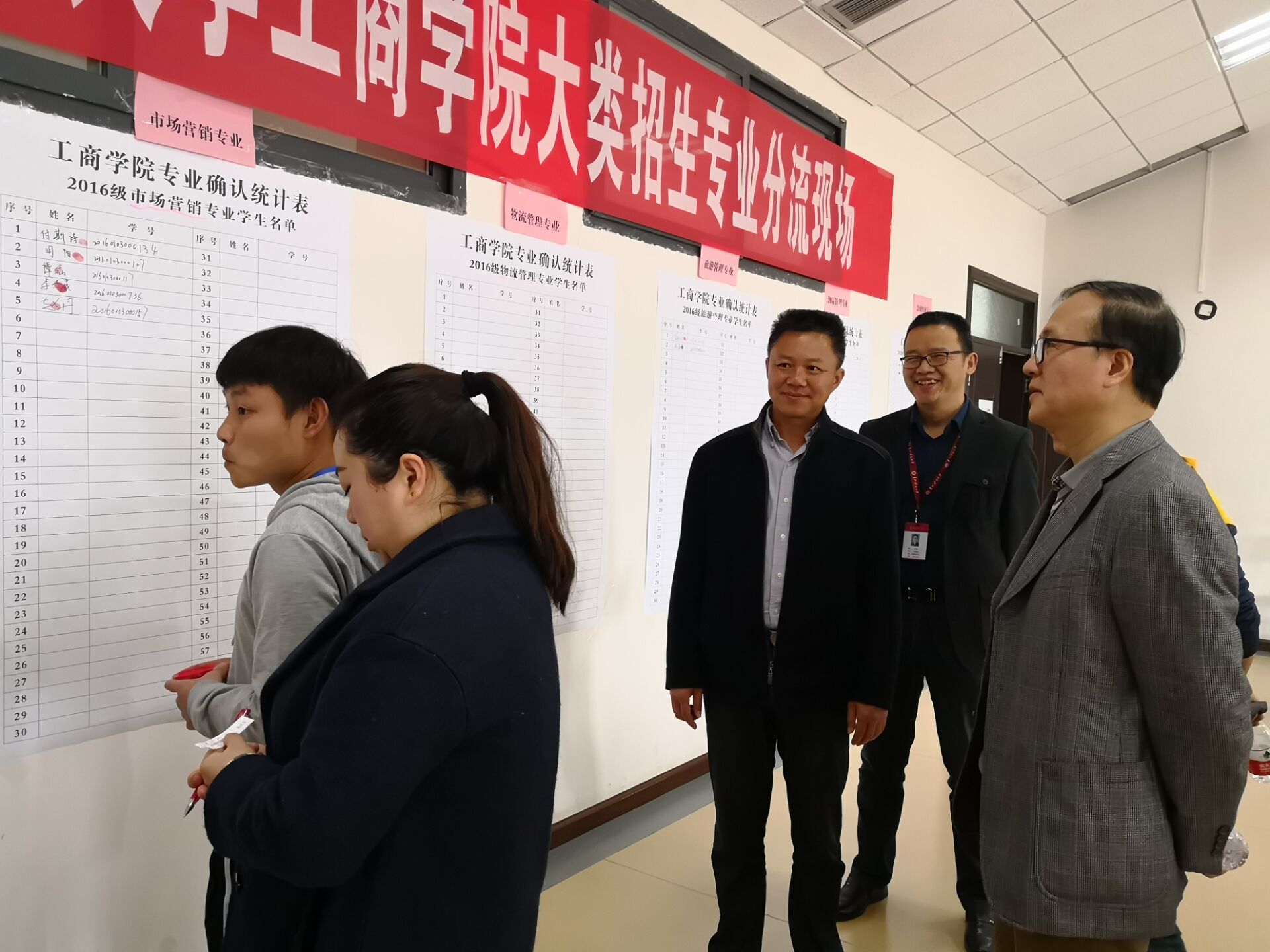 工商学院根据学生的量化综合考评成绩高低和学生志愿,按照学院分流实施细则的要求有序完成了专业分流。共有410名学生参加分流,其中参加跨大类分流学生6名,大类内分流学生404名。最终大类内分流情况如下:工商管理专60名;人力资源管理专业60名;市场营销专业60名;物流管理专业60名;旅游管理专业60名;会展经济与管理专业52名;酒店管理52名。                                                                           缪校长、徐校长亲临现场指导                                                                                             杨校长莅临现场指导                                                                                                专业分流现场