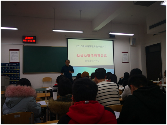 2018年12月19日,工商学院2015级旅游管理专业毕业实习动员暨安全教育会在崇德楼424教室召开,会议由旅游系副系主任舒小林教授主持,毕业实习指导老师及2015级旅游管理专业全体同学参加。