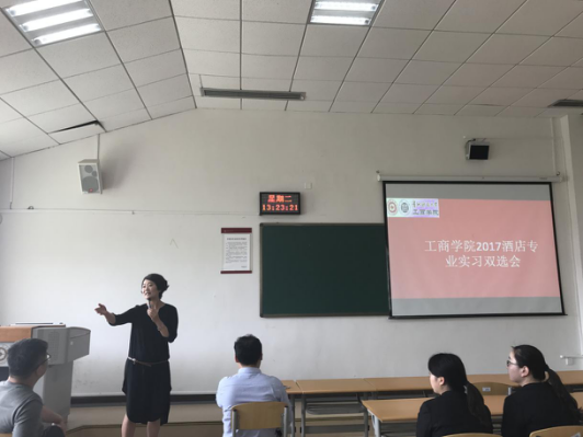 6月6日下午,工商学院在崇德楼520教室举行2014级专业实习双选会。据统计,本次双选会吸引了包括贵阳喜来登大酒店、贵阳中天凯悦酒店等6家国际一线品牌酒店参会,共计提供岗位达120多个。工商学院副院长胡北明教授出席,双选会由旅游系副主任朱婧老师主持,实习带队教师以及2014级旅游系的旅游管理和酒店管理100余名学生参加了双选会。
