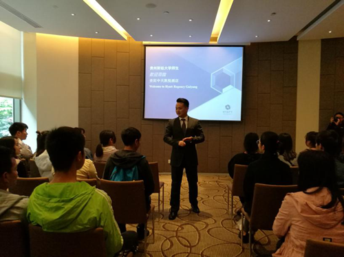 为了让同学们更好地了解关于酒店管理专业的相关知识,真正的认识一个酒店在运作中所涉及的部门以及一些机构,工商学院旅游管理系酒店专业15级酒店管理班学生在旅游系副系主任朱靓老师和谢飞老师的带领下于2017年4月25日到贵阳中天凯悦酒店进行专业认知实习。