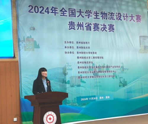 在开幕式上,贵州财经大学校党委副书记彭洁教授代表学校致辞,指出本次大赛目的在于引导大学生关注物流行业的热点问题,激发大学生的创新精神和创业意识,培养大学生的团队协作能力和解决实际问题能力。并表示希望通过这次大赛,能够进一步推动我省高校物流管理专业教育教学改革和创新发展,提升物流管理专业人才培养质量和社会认可度。同时,也为广大师生提供一个展示才华、交流思想、增进友谊的宝贵平台,激发学习热情和创造活力。并以“物流通天下,智慧创未来”表达对此次大赛的深切期望。