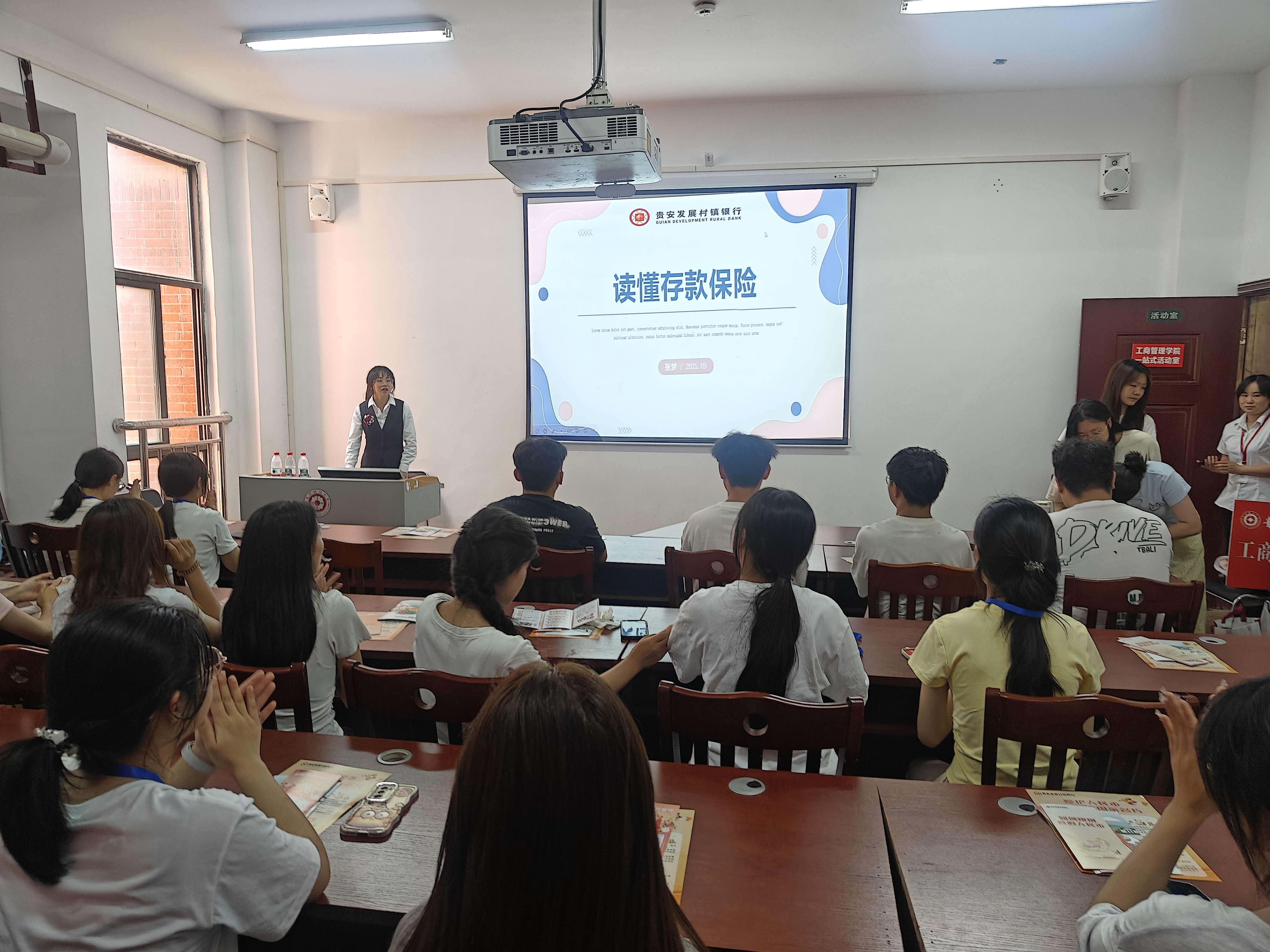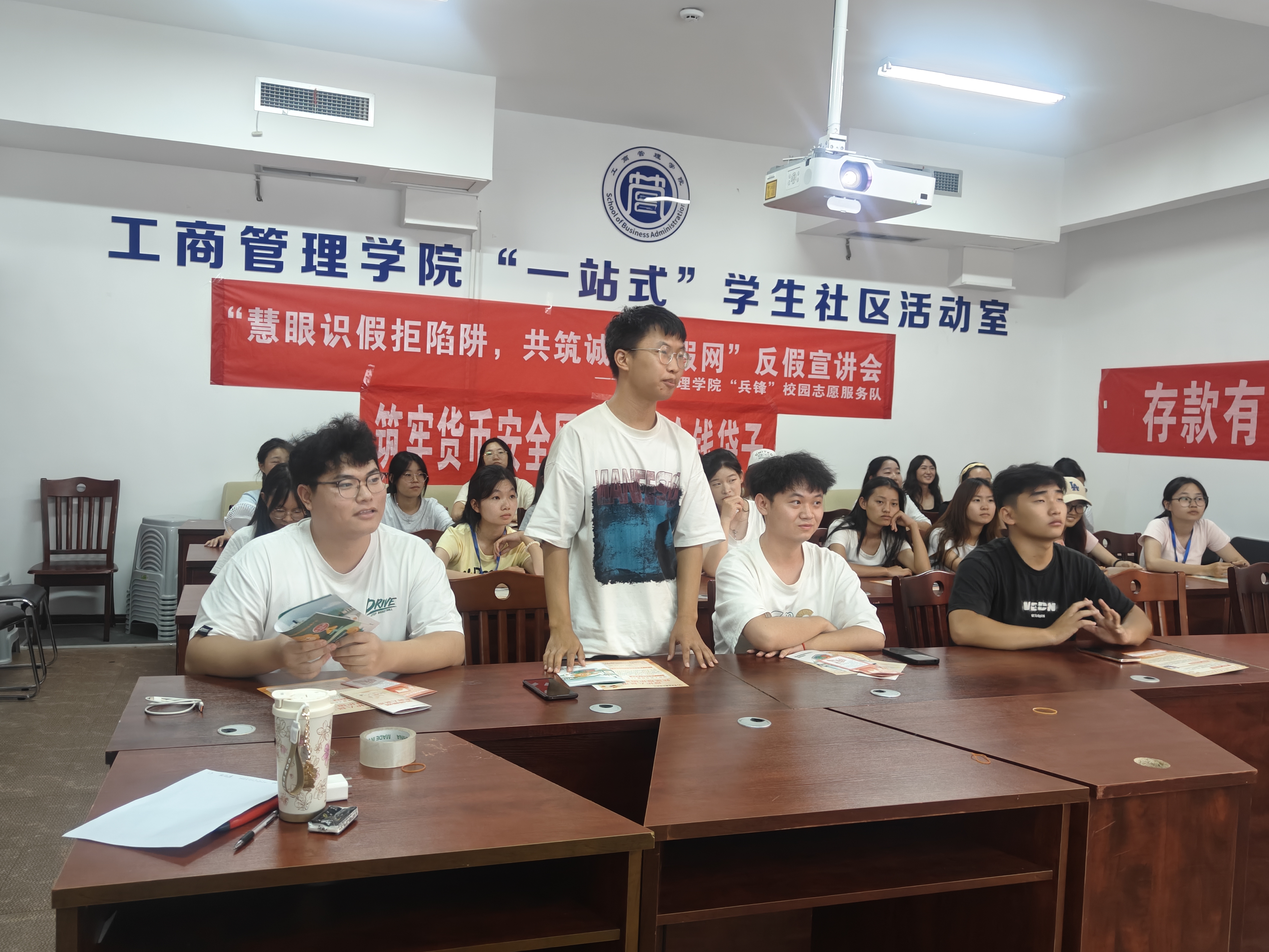 为普及反假货币知识,切实提升师生群体的反假货币意识与识别能力,马会app “兵锋”校园志愿服务队联合贵安新区发展村镇银行,于2025年9月18日在翠竹苑三栋四楼“一站式”学生社区活动室开展“慧眼识假拒陷阱,共筑诚信反假网”主题宣讲会,本次活动共吸引四十余名师生参与,有效强化了同学们对假币风险的防范认知。